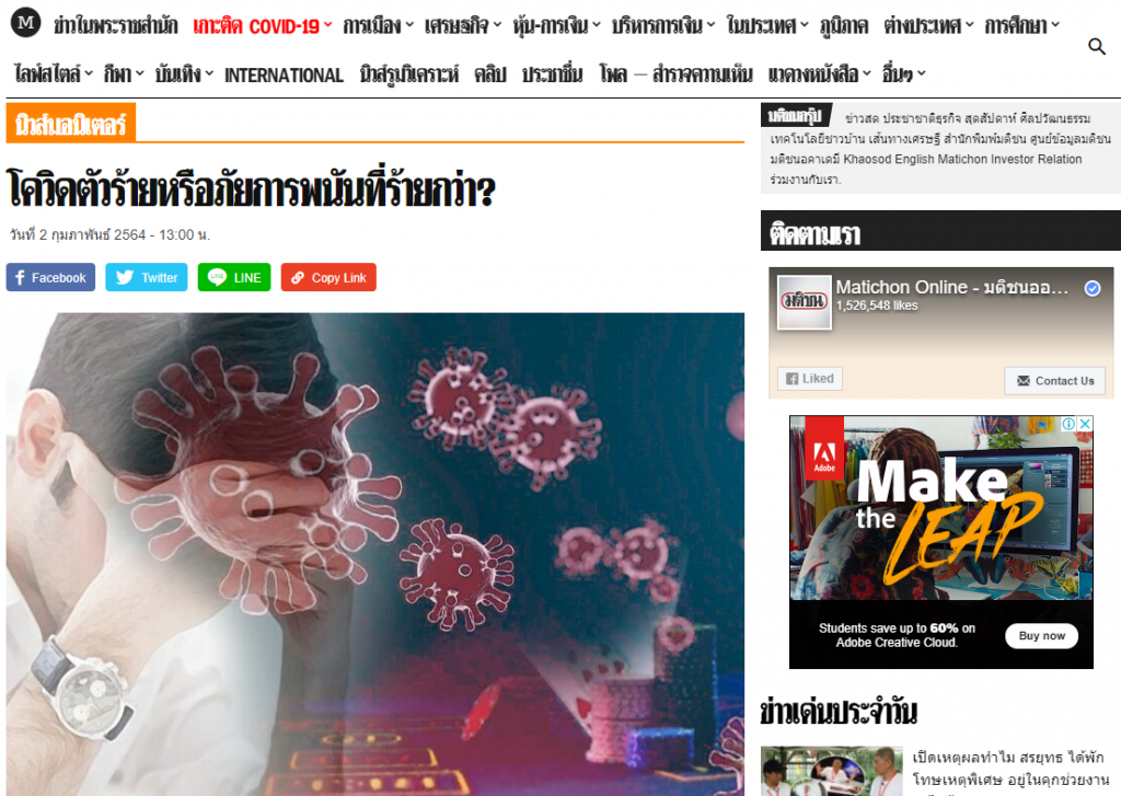 นิภาพร แก้วเทพ นักศึกษาชั้นปีที่ 4 วิชาเอกความสัมพันธ์ระหว่างประเทศ สำนักวิชารัฐศาสตร์และนิติศาสตร์ มหาวิทยาลัยวลัยลักษณ์ ได้เผยแพร่บทความเรื่อง “โควิดตัวร้ายหรือภัยการพนันที่ร้ายกว่า?” บนเว็บไซต์มติชนออนไลน์ ผู้สนใจสามารถอ่านได้ที่ https://www.matichon.co.th/news-monitor/news_2555751