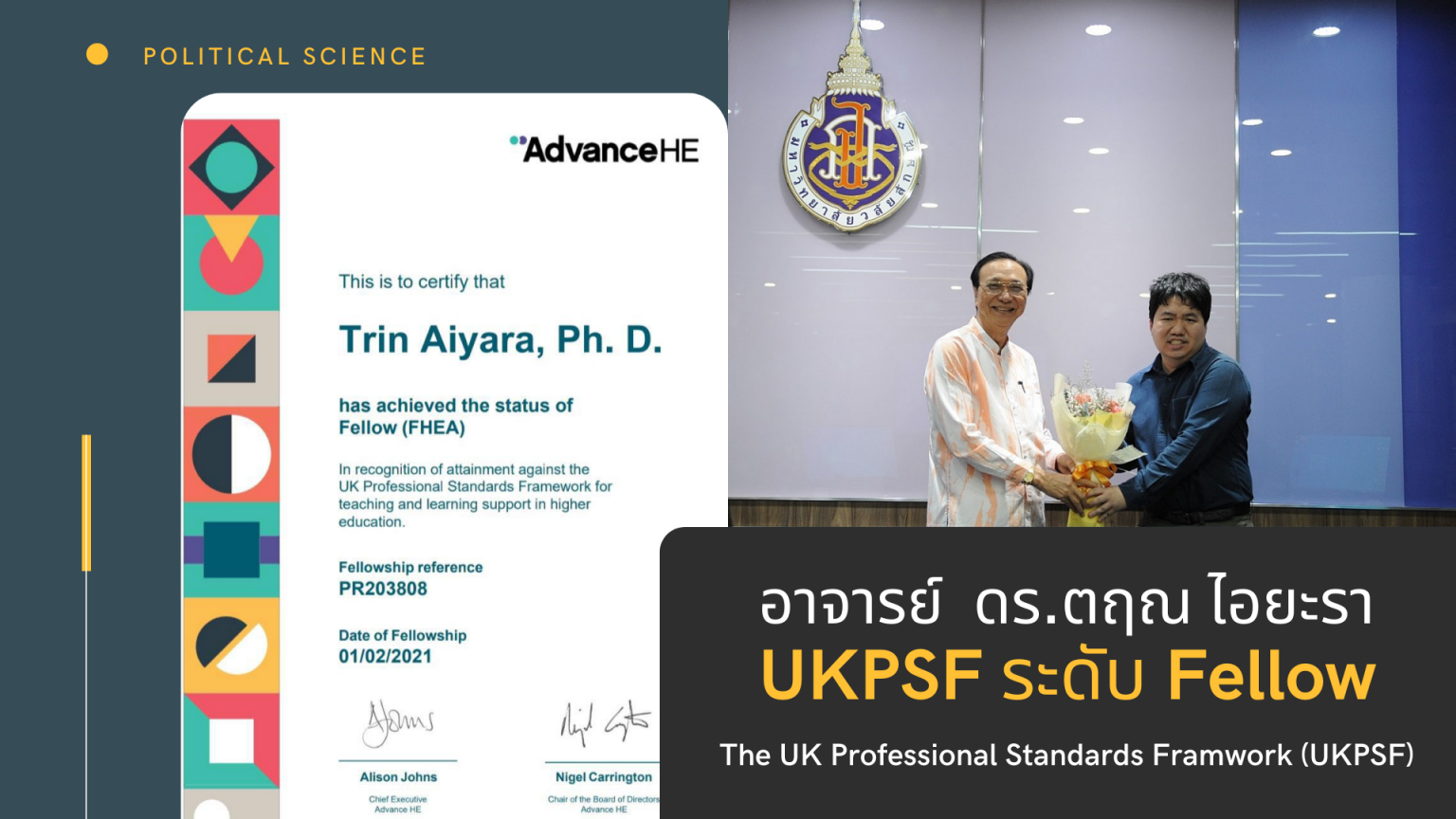 อาจารย์ ดร.ตฤณ ไอยะรา อาจารย์ประจำหลักสูตรรัฐศาสตร์ ได้รับได้รับประกาศนียบัตรของ UKPSF ระดับ Fellow