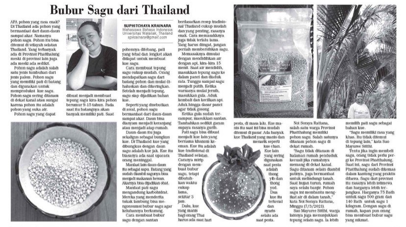 บทความภาษาอินโดนีเซียชื่อเรื่อง “Bubur Sagu dari Thailand” (ขนมสาคูเปียกจากประเทศไทย) ของนางสาวสุพิชญา ไกรณรา นักศึกษาหลักสูตรอาเซียนศึกษา สำนักวิชารัฐศาสตร์และนิติศาสตร์ ได้รับการพิจารณาตีพิมพ์ในหนังสือพิมพ์ Surya ฉบับวันที่ 21 มีนาคม 2021