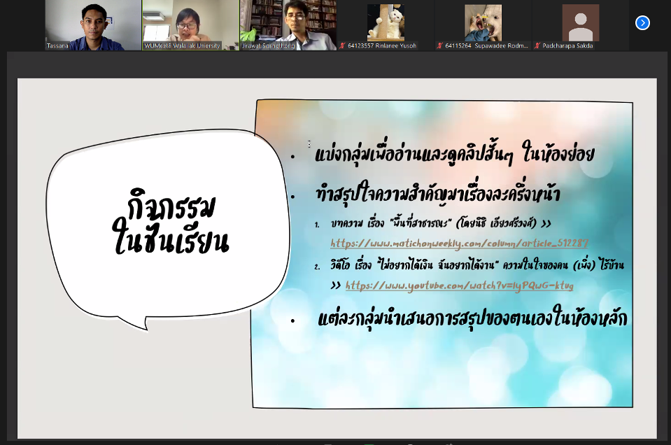 การทำความเข้าใจและจับประเด็นจากข้อมูลที่ได้จากการอ่าน การฟัง และการรับสารประเภทต่าง ๆ นั้นเป็นสิ่งสำคัญต่อพื้นฐานในการเรียนรู้ของนักศึกษา ทั้งสำหรับการเรียนในชั้นเรียน ตลอดจนการใช้ข้อมูลที่ได้มาจากการค้นคว้าเพื่อพัฒนางานวิชาการของตนเอง ด้วยเหตุนี้ หลักสูตรรัฐศาสตร์จึงจัดกิจกรรมพัฒนาทักษะการจับประเด็นและสรุปความสำหรับนักศึกษา โดยดำเนินการผ่านระบบซูมในช่วงบ่ายของวันพุธที่ 2 มีนาคม 2565