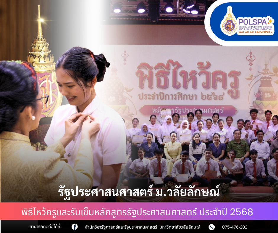 หลักสูตรรัฐประศาสนศาสตร์ มหาวิทยาลัยวลัยลักษณ์ จัดพิธีไหว้ครูและรับเข็มหลักสูตรรัฐประศาสนศาสตร์ ประจำปี 2568 Read More » กรกฎาคม 19, 2025