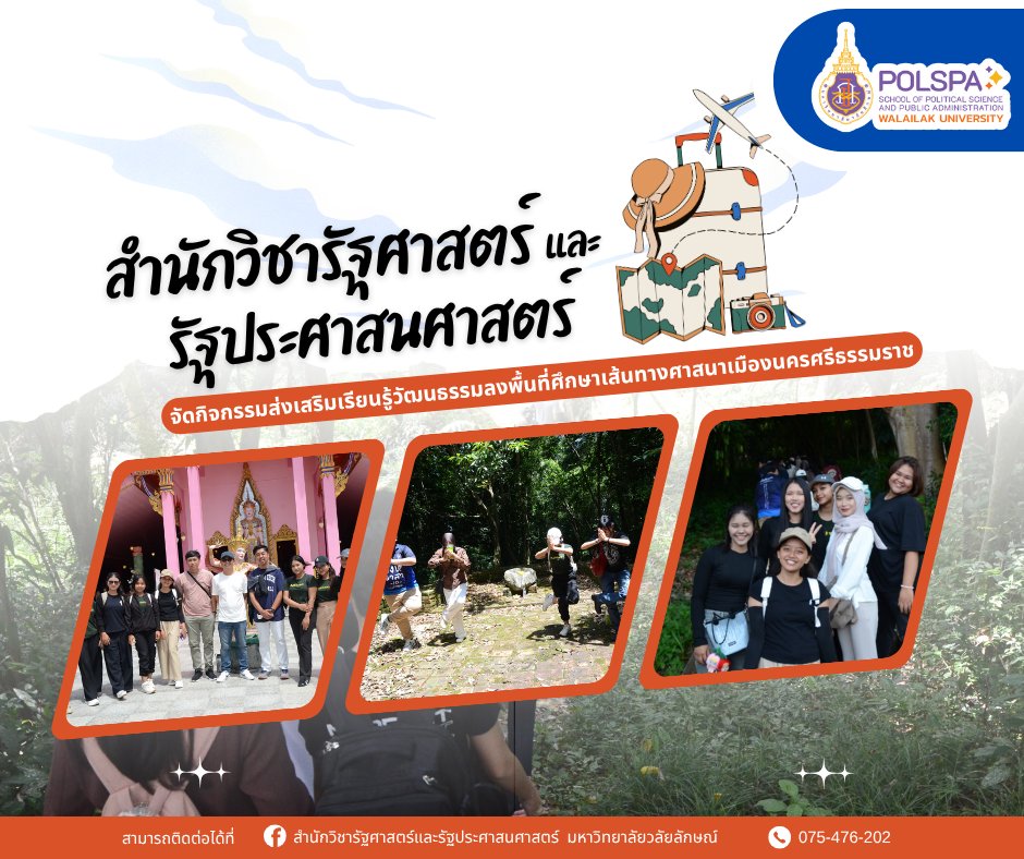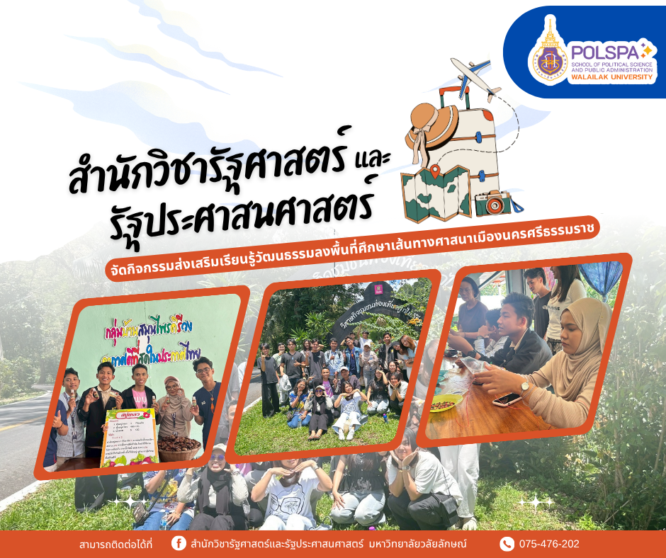 สำนักวิชารัฐศาสตร์และรัฐประศาสนศาสตร์ จัดกิจกรรมส่งเสริมเรียนรู้วัฒนธรรมลงพื้นที่ศึกษาเส้นทางศาสนาเมืองนครศรีธรรมราช Read More » กรกฎาคม 20, 2025