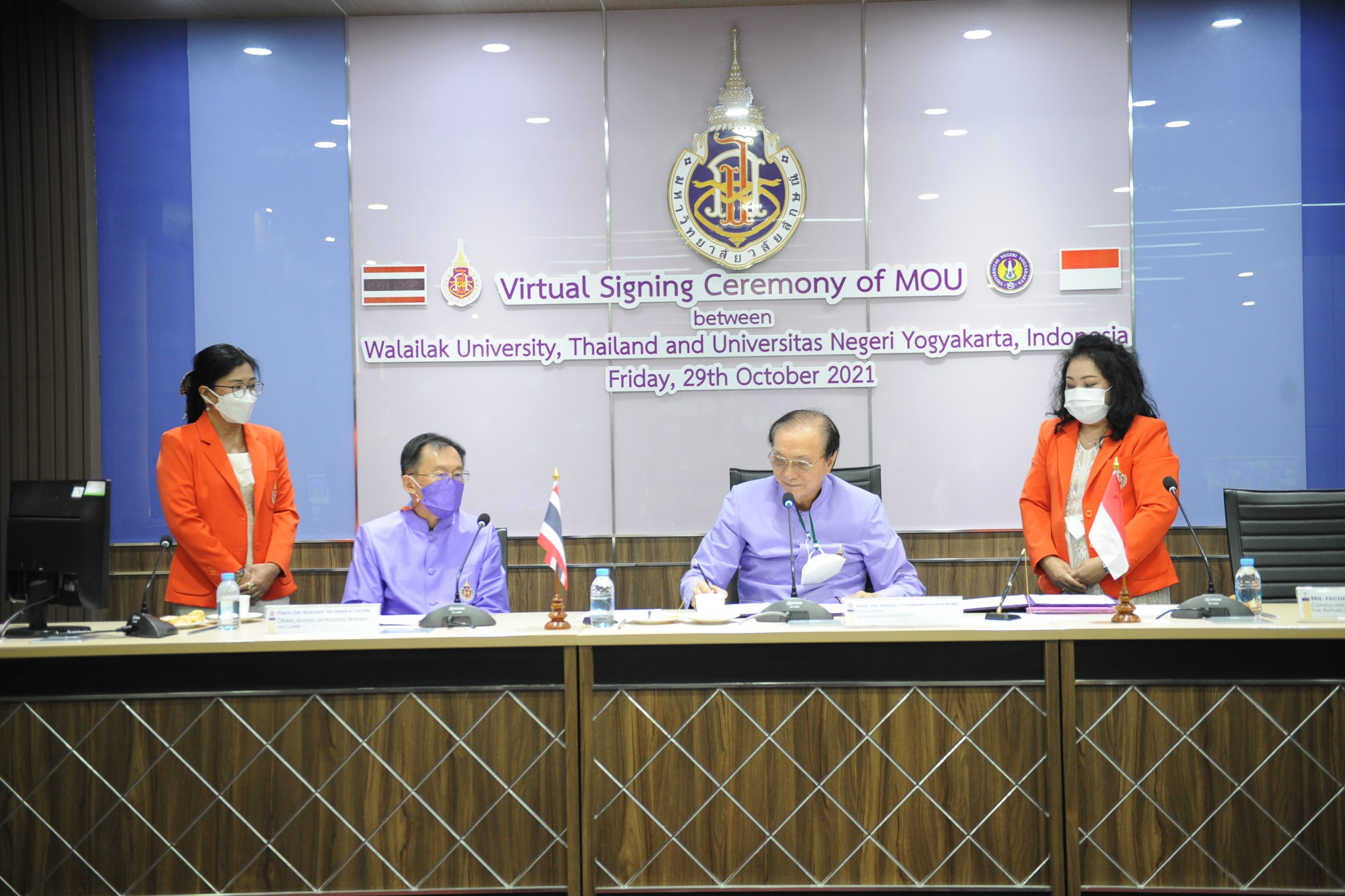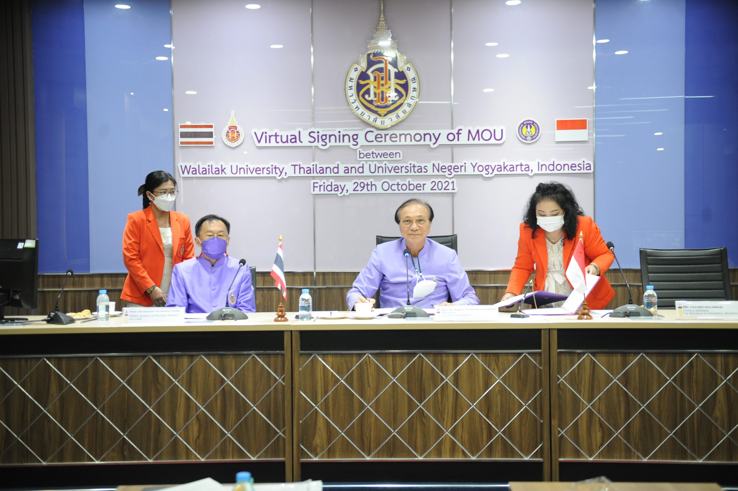 On October 29, 2021, Professor Dr. Surasit Vajirakachorn, Dean of the School of Political Science and Laws, along with staff members from the ASEAN Studies Major of the Political Science Program, witnessed and discussed academic cooperation at the signing ceremony of the Memorandum of Understanding (MOU) between Walailak University and Yogyakarta State University (Universitas Negeri Yogyakarta: UNY), Indonesia.