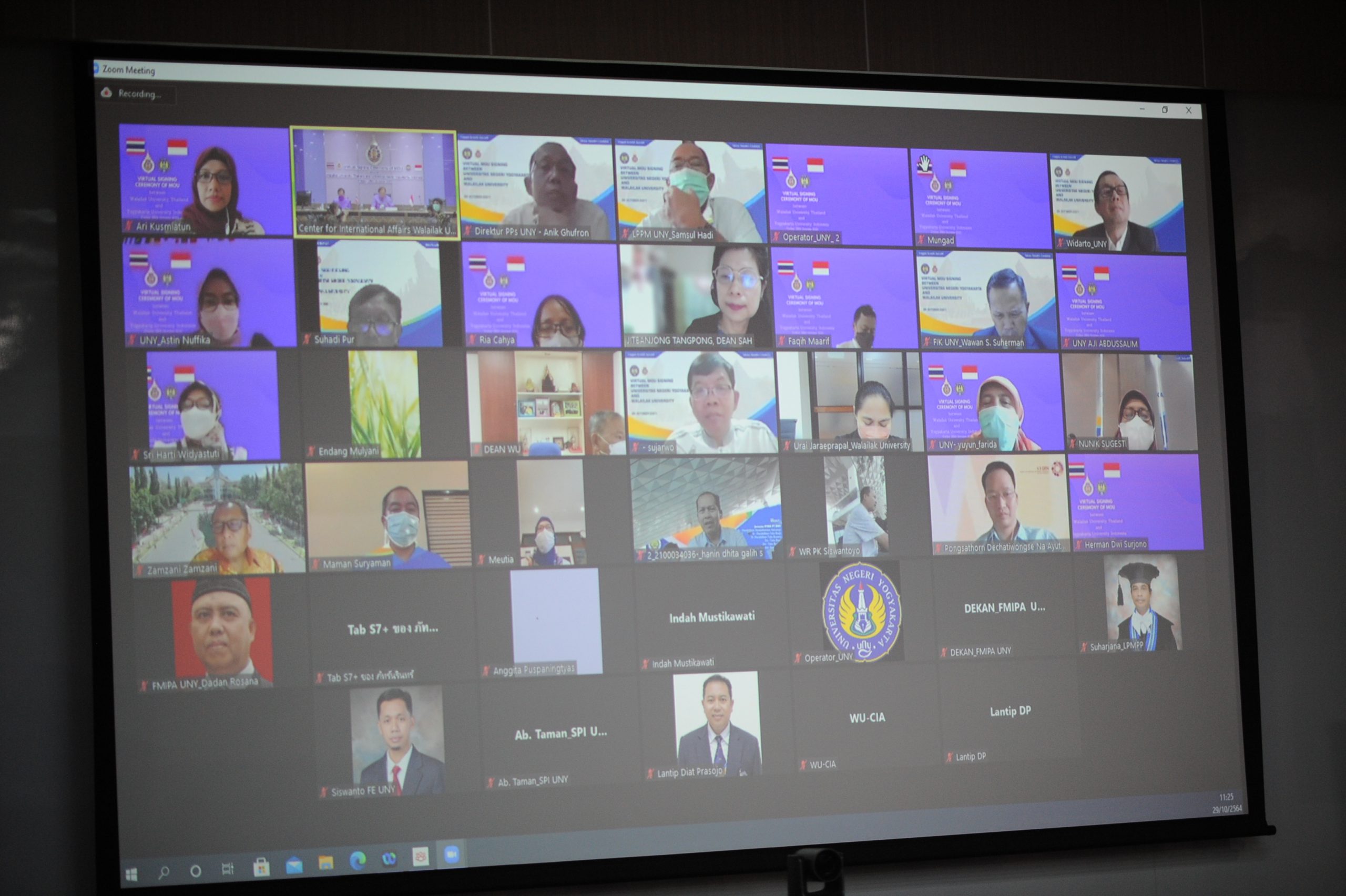The MOU for Academic Cooperation between the two universities was signed during the event by Professor Dr. Sombat Thamrongthanyawong, President of Walailak University, and Prof. Dr. Sumaryanto, M. Kes, President of Yogyakarta State University. The signing ceremony, which was held online, was attended by 35 executives, professors, and staff from Yogyakarta State University and 20 from Walailak University.