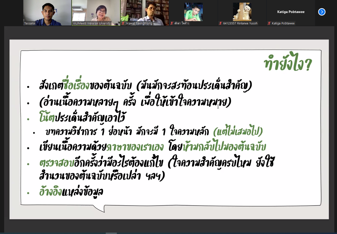 The exercise began with Program lecturers sharing their experiences with students’ struggles in writing and summarizing significant ideas, followed by instruction on how to acquire these abilities. Students were then separated into twelve groups to apply the techniques they had just learned by reading articles, viewing short video clips, and writing summaries of their assignments. At the conclusion, students presented their own group works, and lecturers provided guidance and examples of summarizing from the same sources for students to observe.