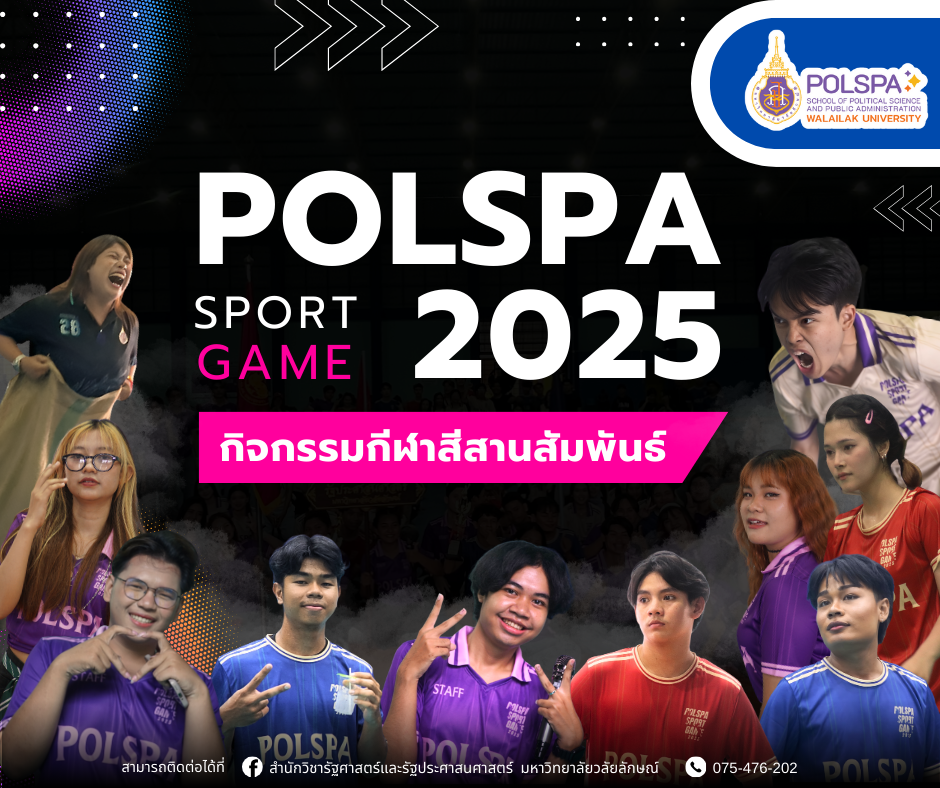 On Saturday, August 16, 2025, the Faculty of Political Science and Public Administration organized the POLSPA SPORT GAME 2025 at the Tum Pang Sports Ground, Walailak University. Students participated enthusiastically in various activities and cheered each other on warmly. Whether it was tug-of-war, sack race, fun run, mud run, volleyball, or football, every activity was filled with fun and positive energy as everyone worked together and supported one another.