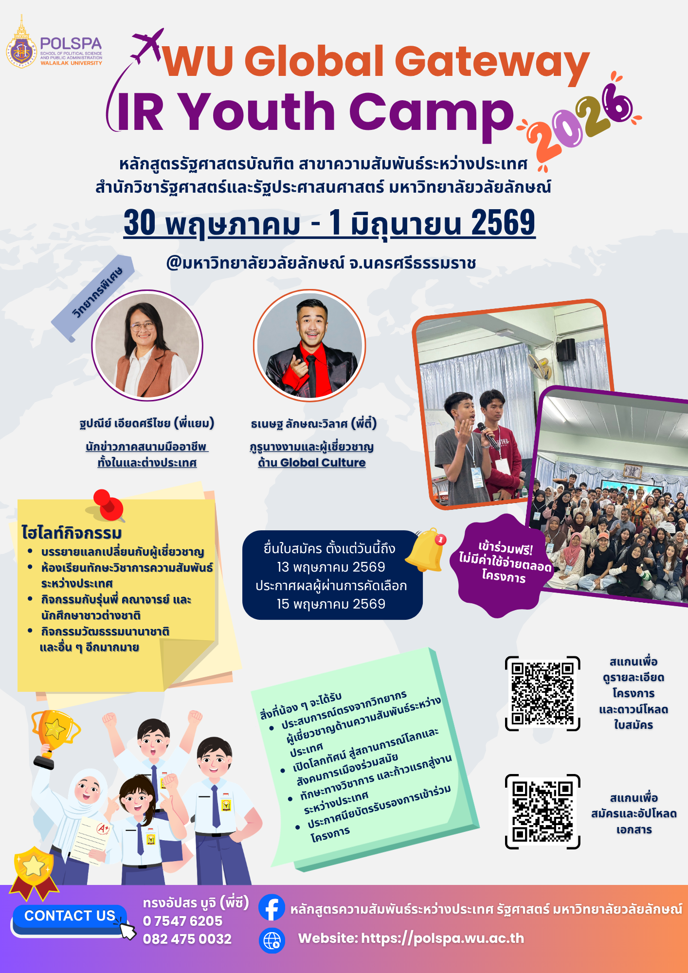 หลักสูตรรัฐศาสตรบัณฑิต สาขาความสัมพันธ์ระหว่างประเทศ สำนักวิชารัฐศาสตร์และรัฐประศาสนศาสตร์ มหาวิทยาลัยวลัยลักษณ์ จัดโครงการ IR Youth Camp 2026 ในวันที่ 30 พฤษภาคม - 1 มิถุนายน 2569 ณ มหาวิทยาลัยวลัยลักษณ์ จ.นครศรีธรรมราช