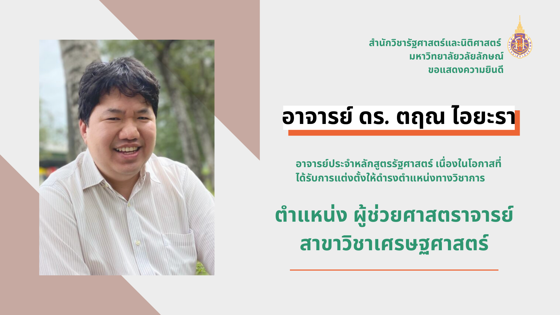อาจารย์ ดร.ตฤณ ไอยะรา ได้รับการแต่งตั้งให้ดำรงตำแหน่งผู้ช่วยศาสตราจารย์ สาขาวิชาเศรษฐศาสตร์ Read More » เมษายน 1, 2022
